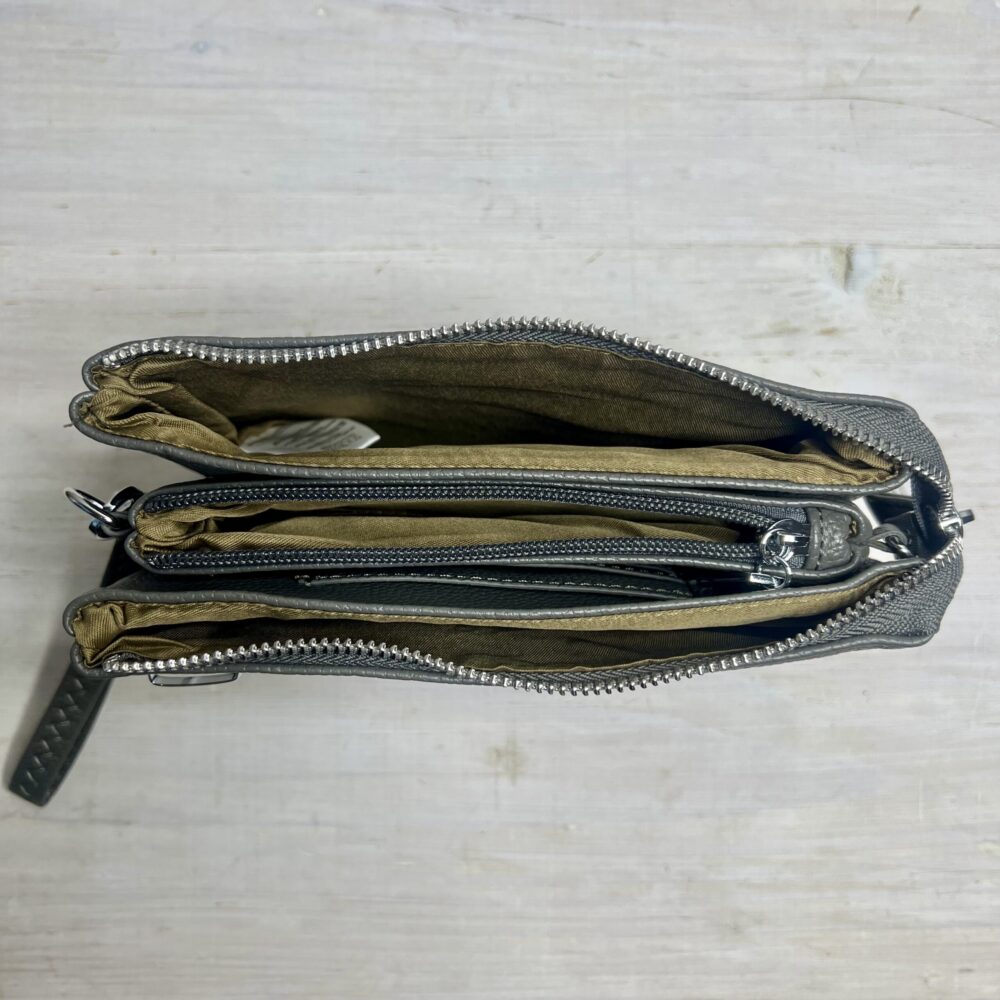 3 separate zipped compartments with card holders with an additional zip pocket on the back.